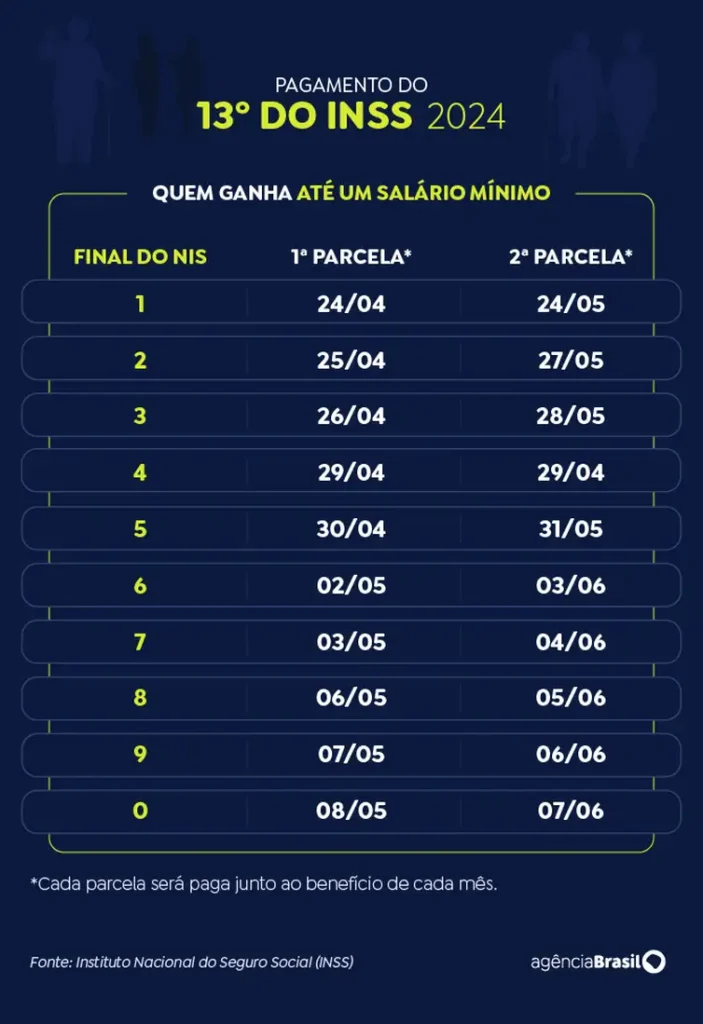 O pagamento de 50% da gratificação natalina virá junto com o benefício do mês corrente, que será pago de 24 de abril a 8 de maio. A segunda parcela sairá junto com o calendário de maio, que vai de 26 de maio a 6 de junho.