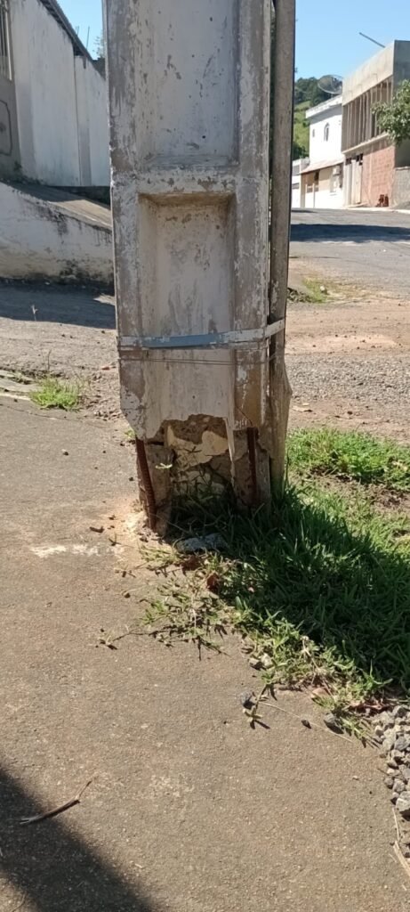 Um poste localizado na Rua Sebastião Zaquieu esquina com a Rua Francisco Jacinto da Silva, está danificado e apresenta risco de queda, gerando grande preocupação entre os moradores e pedestres que circulam diariamente pela região. O poste está com sinais visíveis de colapso do concreto em sua base, sendo sustentado apenas pelos vergalhões podendo comprometer sua estabilidade, principalmente em dias de vento forte ou chuva.