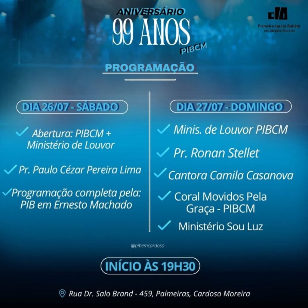 A comemoração será nos dias 26 e 27 de julho com início previsto para as 19:30h na sede da Primeira Igreja Batista que fica situada à rua Manoel Pinheiro Sobrinho – 459, (antiga Dr. Salo Brand), Bairro Palmeiras – Cardoso Moreira.